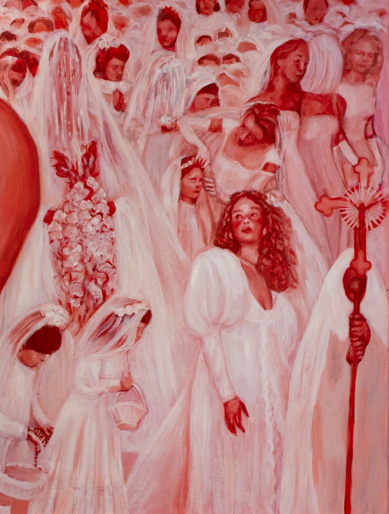This painting uses the metaphor of herding to symbolize how women are ceremoniously socialized into roles of submission and conformity through ritual and doctrine. The title and horse imagery is in reference to David Lynch’s 1992 film, Fire Walk With Me, which explores the impact of evil, focusing on the darkness of cycles of abuse that feed on innocence. The mass of women and girls clad in sacramental dress, are used throughout to emphasize conditioning and indoctrination. Central to the herd is a riderless white horse, Biblically associated with purity and victory, particularly in Revelation, where Christ returns to triumph over evil. Here, the horse is riderless, the herd aimlessly gathered embody a meaningless cycle of guilt, shame, and devotion in the absence of deliverance.